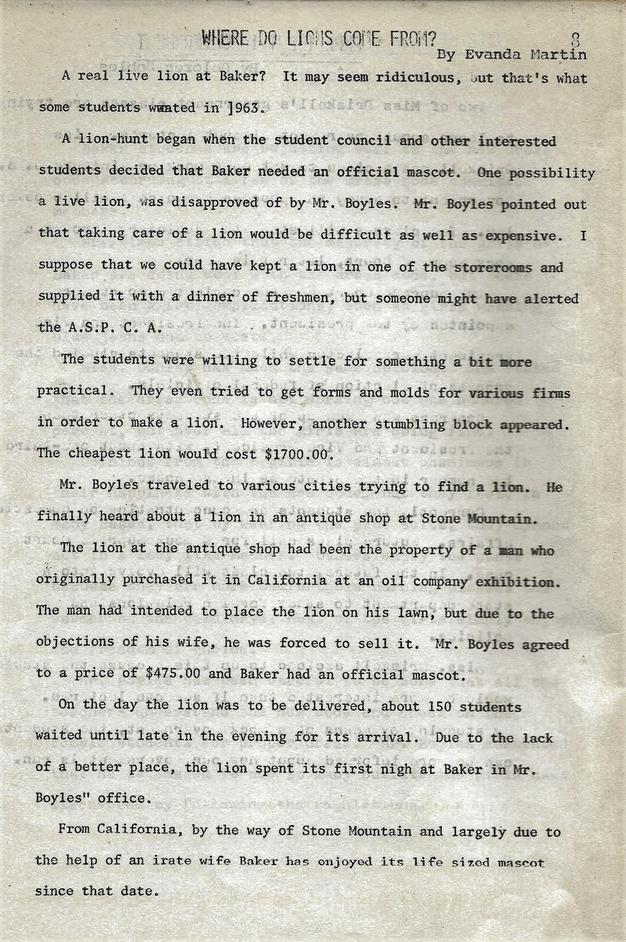 The story on how Oscar Bpyles found the plexiglass lion. I found this is a coipy of the BHS Literature publication "The Lions Roar" circa approx.1970